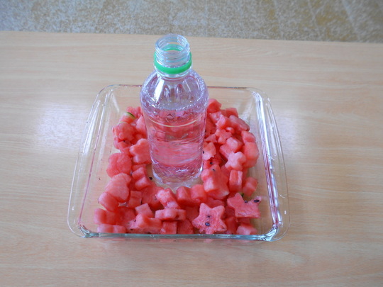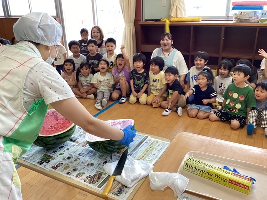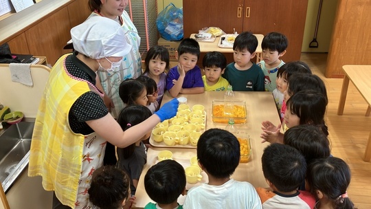 8月6日(火)2歳児 うさぎ組でフルーツポンチを作りました。子どもたちにスイカの型抜きをお願いしました。初めはスイカの硬さに苦戦していましたが、少しずつ慣れてくると、たくさんの☆・♡などが出来上がりました。