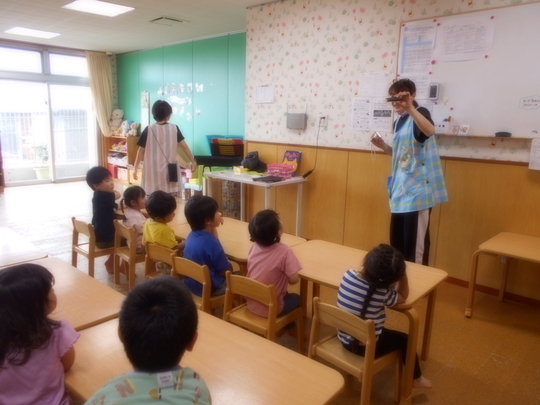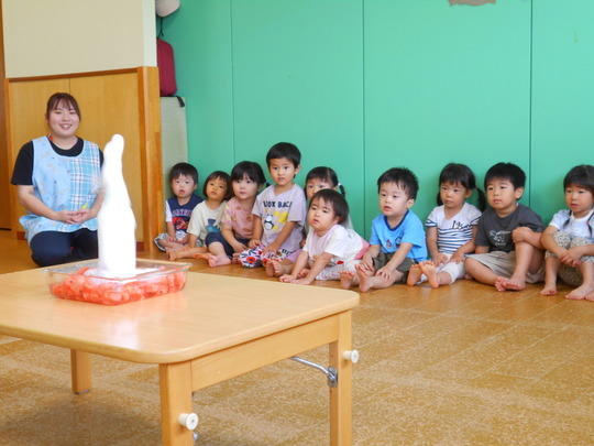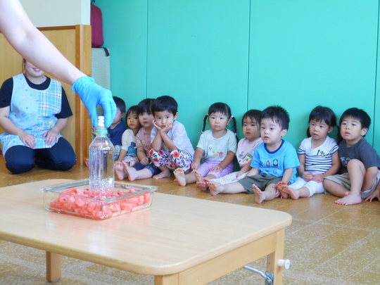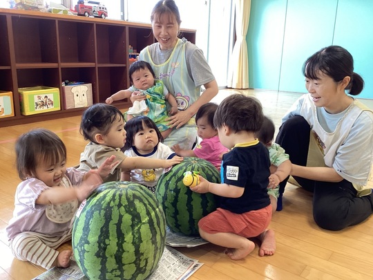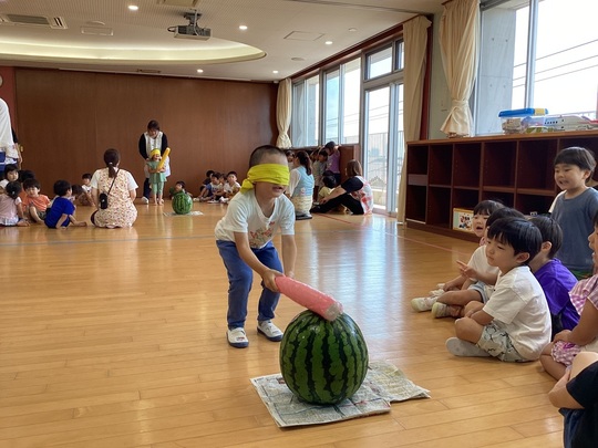 暑い日が続いていますが、7月28日(月)今年もスイカ割りごっこをして、夏らしい遊びをしました。
