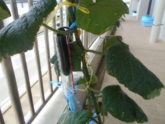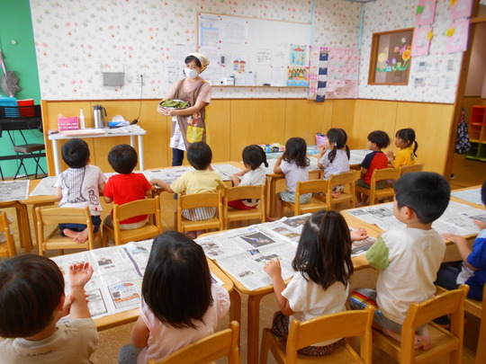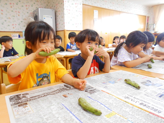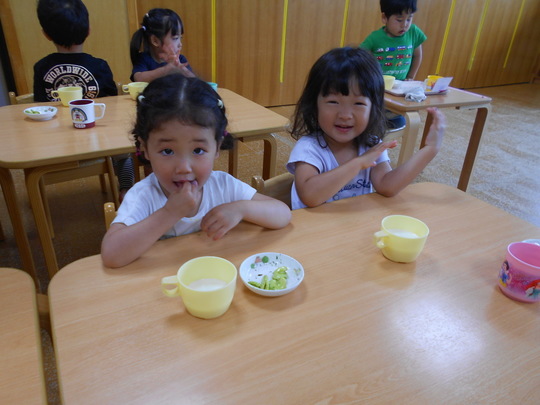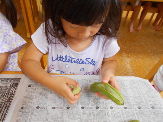 5月から育てていたキュウリの苗に実がなりました。ハート形の入れ物を被せていました。切った断面を見て「わー!ハートになってるー」と大喜びでした。みんなでひと口づつ食べました。