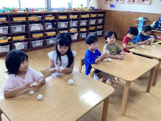 10月3日(金)食育で、お月見だんごつくりをしました。ぞう組のお友だちは栄養士の先生から、お月見の意味や秋の収穫に感謝する気持ちを教わりました。