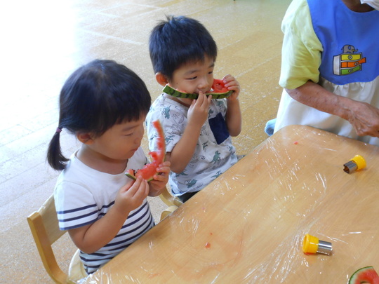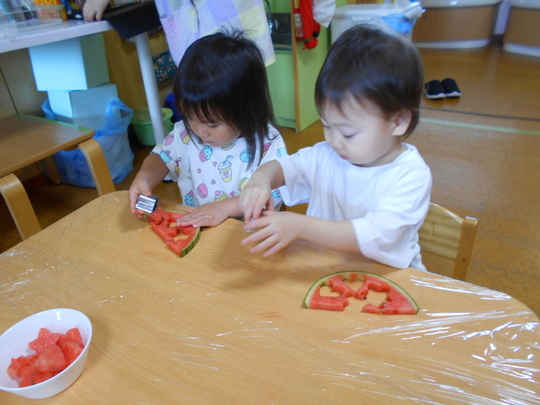 型を抜いているとスイカのあまーい香りが保育室に広がり、食べたくなってしまったようで、余った部分をパクっと食べていました