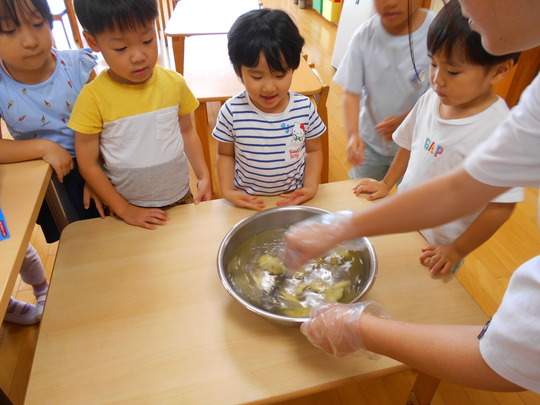 6月18日(水)きりん組のお友だちがフルーツポンチ作りに挑戦しました。まずはみんなでバナナをカット!ナイフを使って上手にカットすることが出来ました。最後の仕上げに炭酸水にラムネを入れて…「しゅわしゅわ~」。ボトルからあふれた泡を見て驚いでいました。出来上がったフルーツポンチは冷やして給食のデザートでおいしくいただきました!