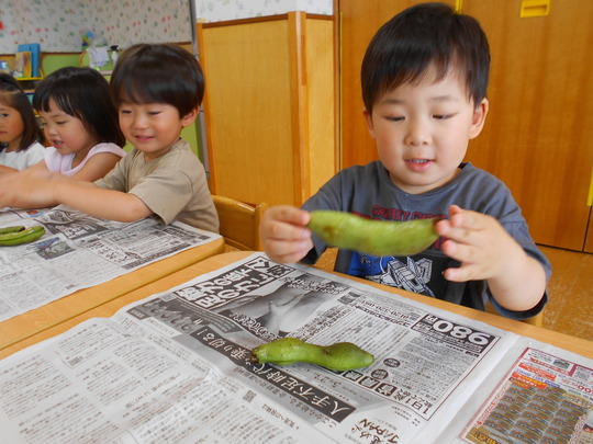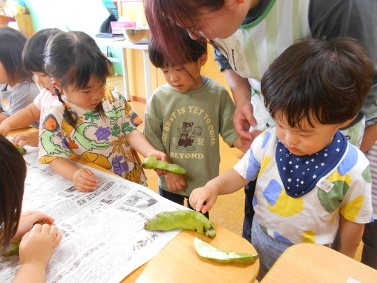絵本「そらまめくんのベット」で「そらまめ」を知っていましたが、実際に握ってみると「ぜんぜんふわふわしてない」「皮がかたい」「ちょっぴり…くさい…」など様々な感想が聞こえてきました。