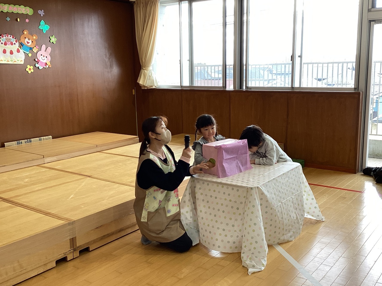先生からの出し物は「箱の中は何でしょう?」。ドキドキしながら箱の中に手を伸ばす子どもたちの様子が、とってもかわいかったです。
