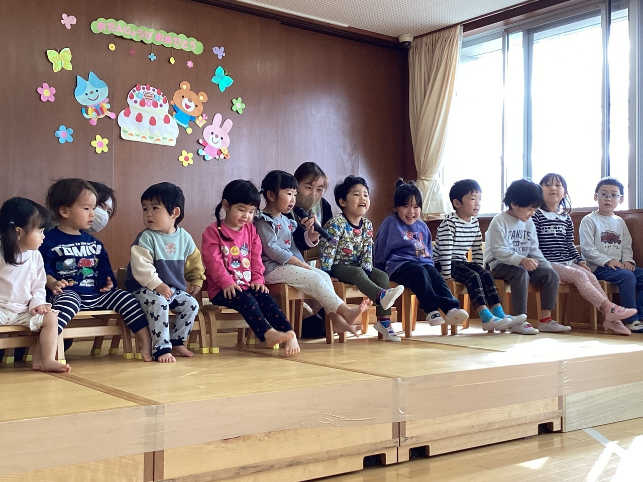 11月生まれのお友だち13名の誕生会が行われました。好きな動物や好きな食べ物を聞かれ、しっかりと答えてくれる姿に成長を感じました。