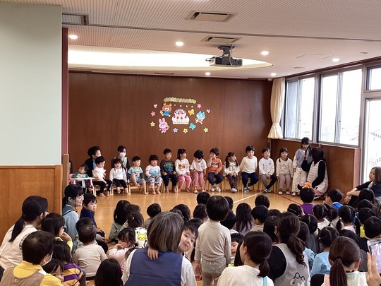 5月20日(火)に誕生会が行われました。5月は8名のお友だちが誕生日を迎えます。インタビューでは好きな動物や食べ物を教えてくれました。先生の出し物は「バルーンシアター」で幼児組の誕生児のお友だちも参加し楽しい会になりました。