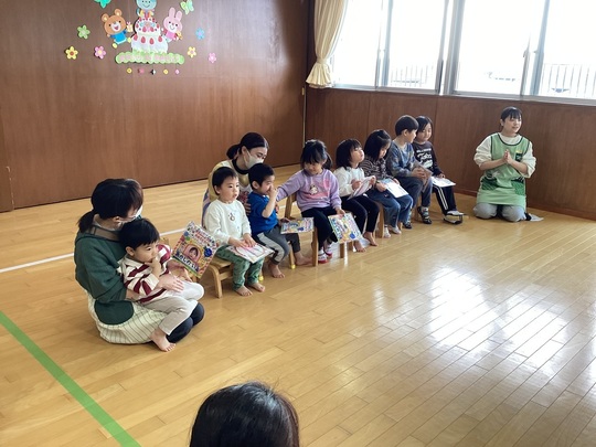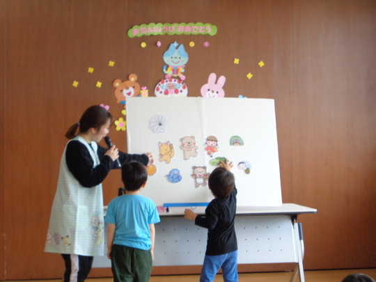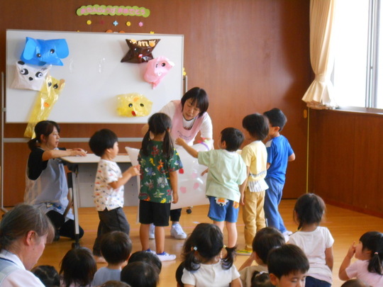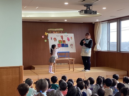 先生の出し物は、パネルシアター「だれのプレゼント?」です。「たれのかな?」と子どもたちは興味津々!今回は誕生児の子どもたちにもお手伝いしてもらい、一緒にパネルシアターを盛り上げてもらいました。