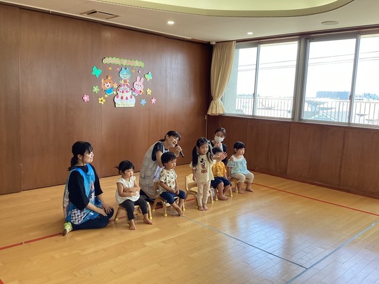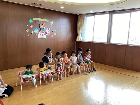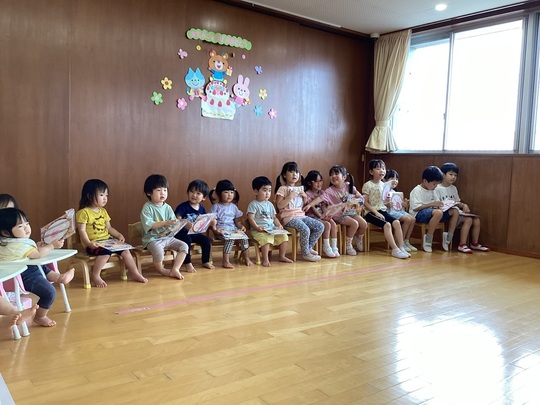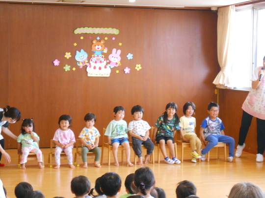 8月19日(火)誕生会が行われました。今月は7人のお友だちが誕生日を迎えます。お名前・年齢・好きな動物や食べ物を立派に答えてくれ、クラスのお友だちからはお誕生日のうたとカードのプレゼントをもらいとっても嬉しそうでした。先生の出し物は「おばけのばけたくん」のお話しでした。