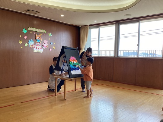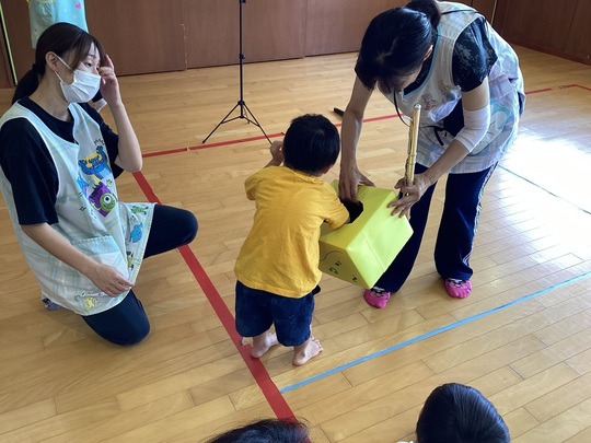先生からの出し物は「箱の中は何でしょう?」。ドキドキしながら箱の中に手を伸ばす子どもたちの様子が、とってもかわいかったです。