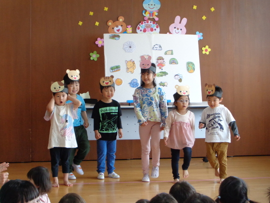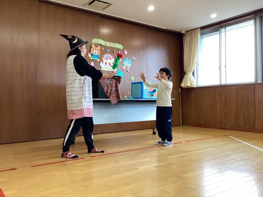 先生の出し物は「はじめてのおつかい」を楽しみました。ケーキの材料を買いに、子どもたちがお買い物に挑戦!材料を持っている先生を探して「これください!」と買い物する姿はとてもかわいかったです。無事に材料が揃いバースデーケーキが完成しました。賑やかな楽しいお誕生会になりました。