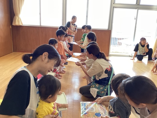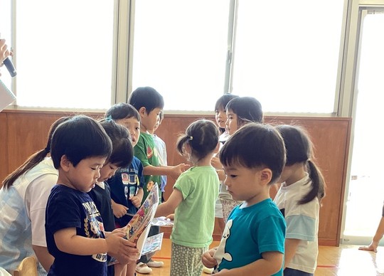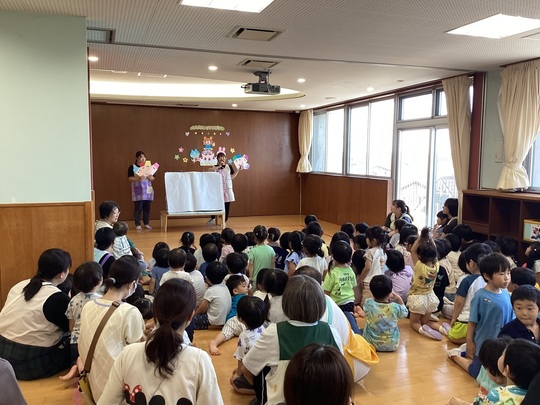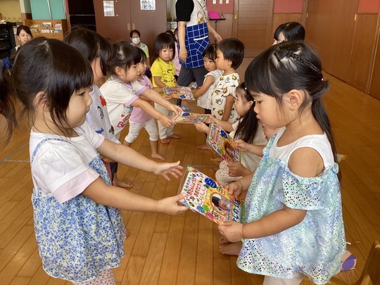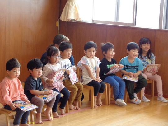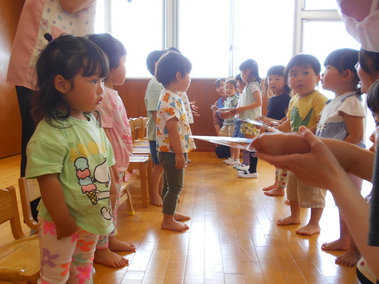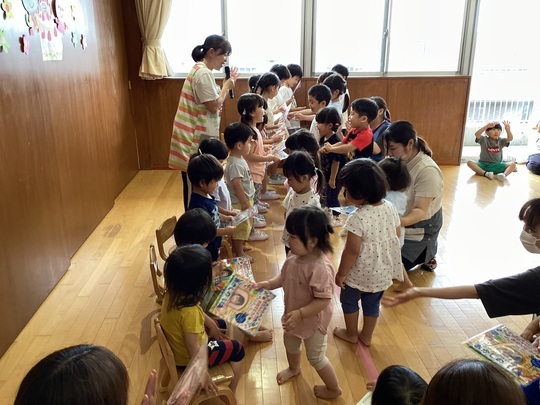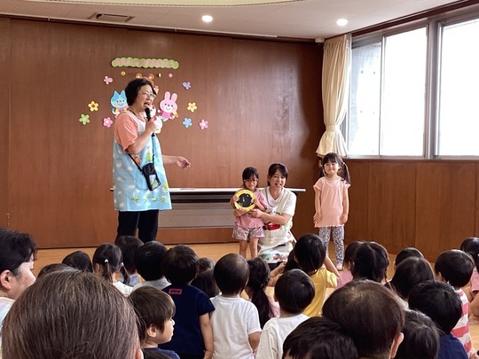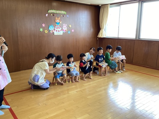 7月22日(火)に誕生会が行われました。6人のお友だちが誕生日を迎えました。恥ずかしくて名前や質問に答えることが出来なかった子もいましたが、誕生日カードをクラスのお友だちから受け取ってうれしそうにしていました。先生の出し物では、「くれよんのくろくん」のお話でお誕生児のお友だちも前に出てお手伝いをしてくれました。