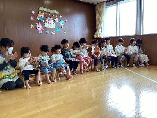 4月22日(火)に誕生会が行われました。新年度初めてのお誕生会。4月は13名のお友だちがお誕生日を迎えました。クラスのお友だちからお誕生日カードを受け取ってとてもうれしそうでした!先生の出し物の際は幼児組のお誕生児の子どもたちが参加し、「さんぽ」を踊って見せてくれました。
