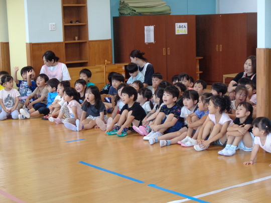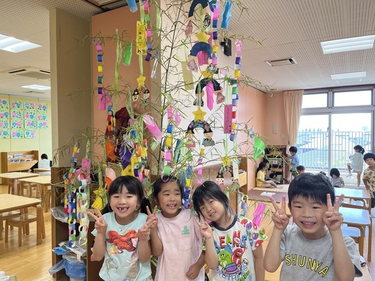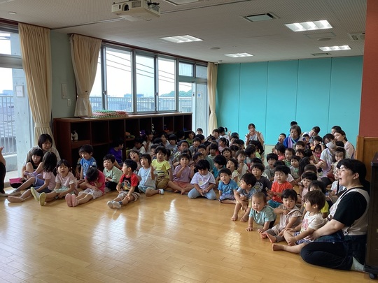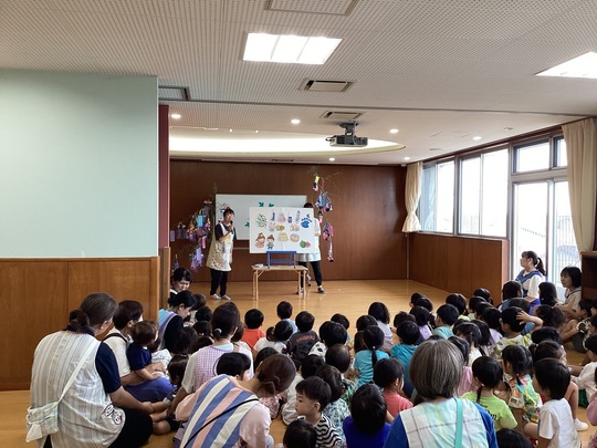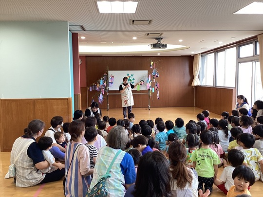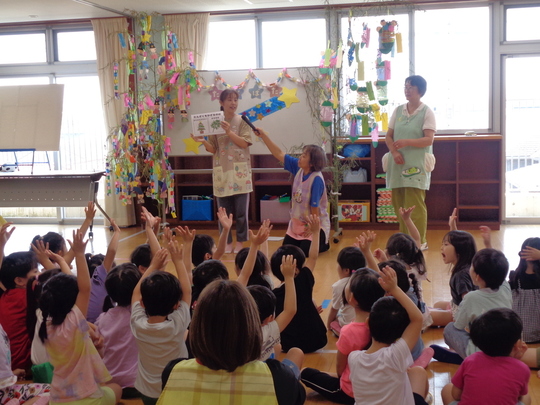 7月7日(月)七夕集会を行い、各クラスの願い事を発表しました。みんなで七夕の手遊びをし、先生から「七夕飾りの由来」のお話がありました。パネルシアターでは「七夕のおはなし」でクイズもあり楽しんでいました。最後に全員で「たなばたさま」を歌いました♬