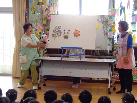 本日「七夕集会」を行いました。最初は「彦星・織姫」が登場する手遊びを楽しみました。盛り上がったのは「七夕クイズ」。正解すると大喜びです。パネルシアターは「パンちゃん」がお願い事を叶えてあげるお話でしたが、「可愛いドレスを着たーい」「おなかいっぱいトウモロコシを食る」等お願い事が叶うと「いいなー」とうらやましそうでした。