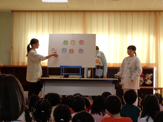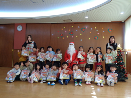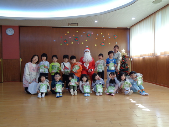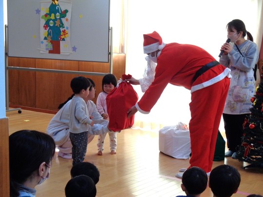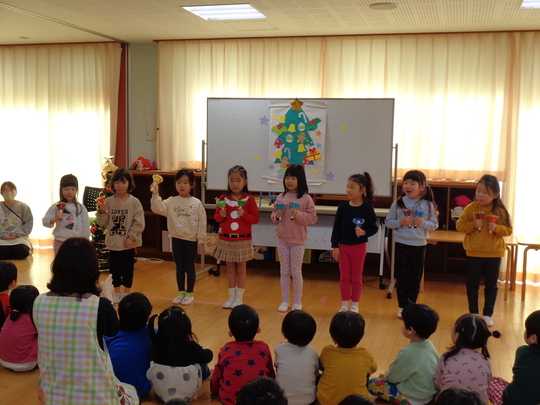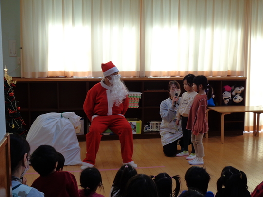 12月24日(火)にクリスマス会が行われました。まず初めに「クリスマスについて」のお話しがありまた。ぞう組お友だちはハンドベルで「ドレミの歌」を演奏してくれました 先生の出し物では「だれのプレゼント」。その後、サンタさんの登場!プレゼントをもって遊びに来てくれました。
