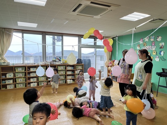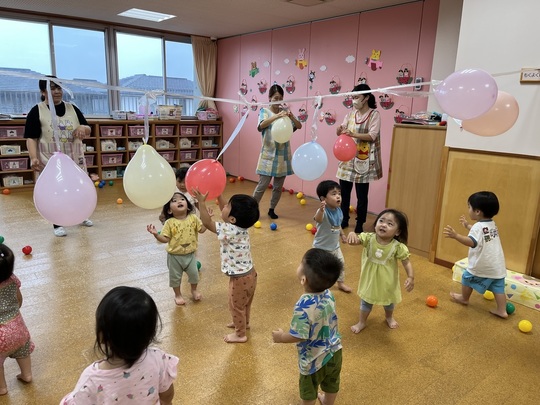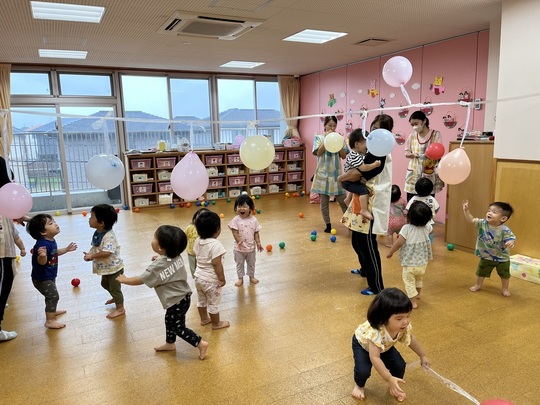 りす組も風船遊びを楽しみました。ぶら下げた風船が届きそうでとどかない…何度もアタック!をしていました。