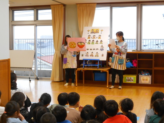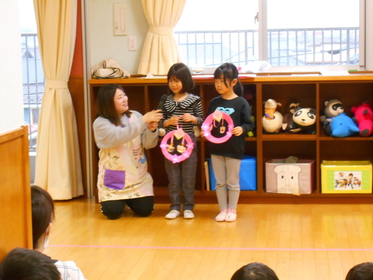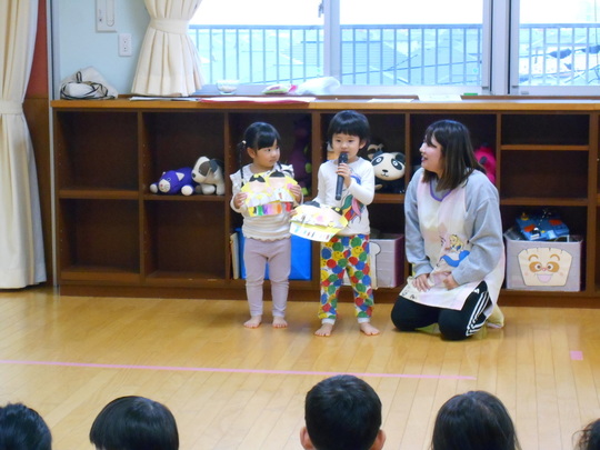 3月3日(月)にひなまつり集会を行いました。全クラスホールに集まって、「手あそび(グーチョキパーでおひなさま)」「ひなまつりの由来(ひなまつりってなぁに)」「ひなまつり製作の発表」がありました。「ひなまつりの由来」のお話しではクイズが出て、正解すると盛り上がって楽しく参加していました。製作発表は各クラスのお友だちがどのように作ったか、難しかったところなどお話してくれました。