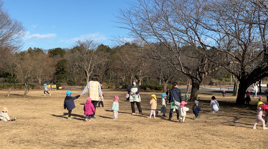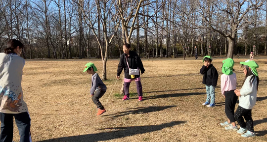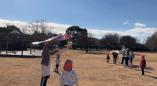 大掃除も終わり、0歳児から5歳児みんなで山公園へ行ってきました。初めはコツが分からなかった凧揚げも、保育士と一緒に楽しんでいるうちにやり方を覚えたぞう組。小さいクラスにも教えてあげることができました。縄跳びも何回跳べたか数をかぞえたり、縄の中でくるくる向きを変えて跳ぶ子もいました。
