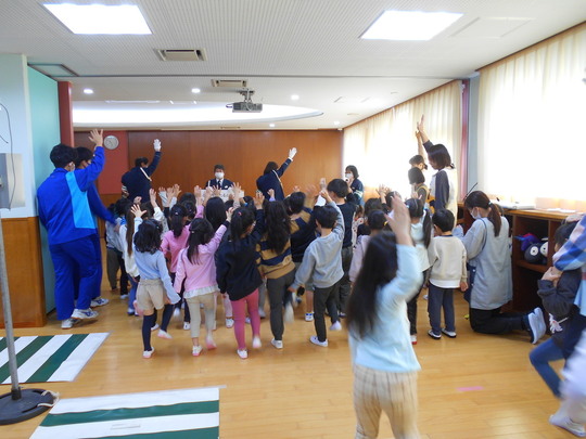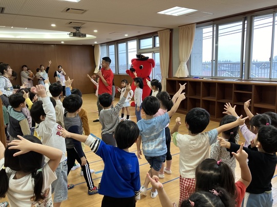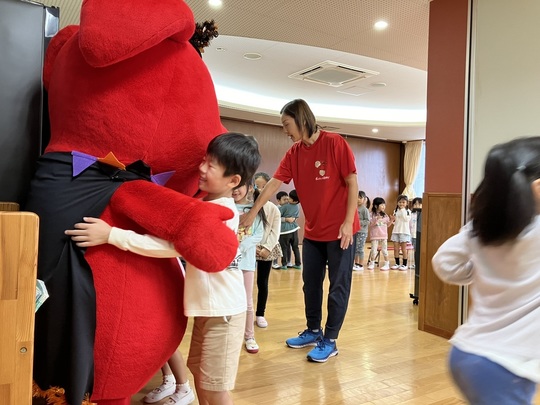 チーバくんが登場すると、子どもたちは大興奮!まずはみんなで集合写真を撮影しました。次に、運動会の準備体操で行う「ケチャマヨ体操を」チーバくんと一緒に元気いっぱい踊りました♫