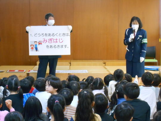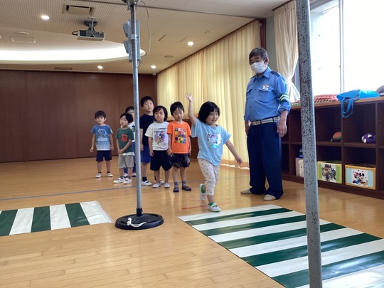 7月9日(水)幼児組お友だちが交通安全教室に参加しました。印西市交通指導員の方が来園し、動画・イラストやクイズで交通ルールを学びました。