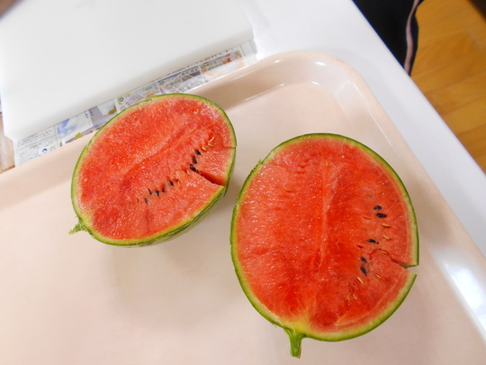 いよいよ包丁を入刀!「中身が白かったら...どうする?」とみんなで心配しましたが、中身は真っ赤!とってもおいしそうでした。給食のデザートにみんなで食べました。味はどうだったかな?