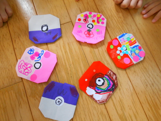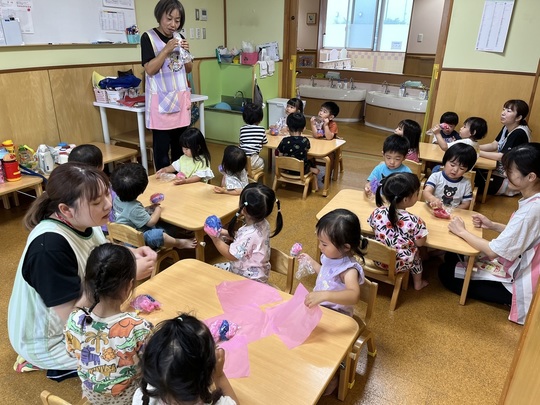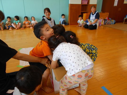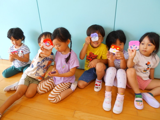 8月27日(火)今日はぞう組ときりん組で宝さがしごっこをしました。宝物はぞう組が作った「モンスターボール」隠されている場所は、カーテンの裏、棚の中、見ただけではなかなかわからない場所。「分からないときは、お兄さん・お姉さんに聞いてごらん」と保育者が声をかけても、恥ずかしがってなかなか声を掛けられないきりん組の子どもたち。ホール内に隠されているボールを見つけた時は嬉しそうでした。