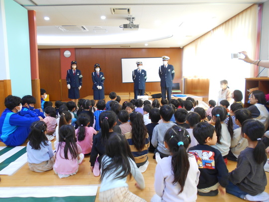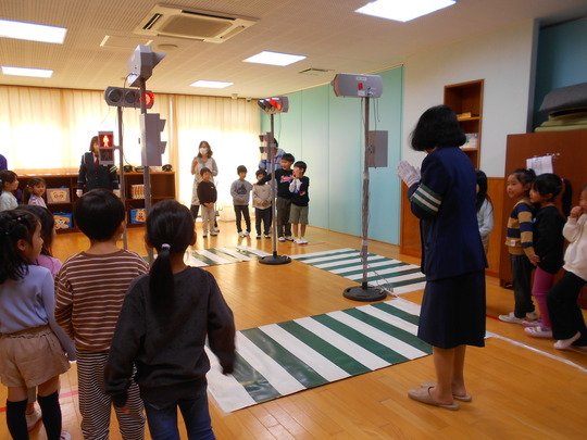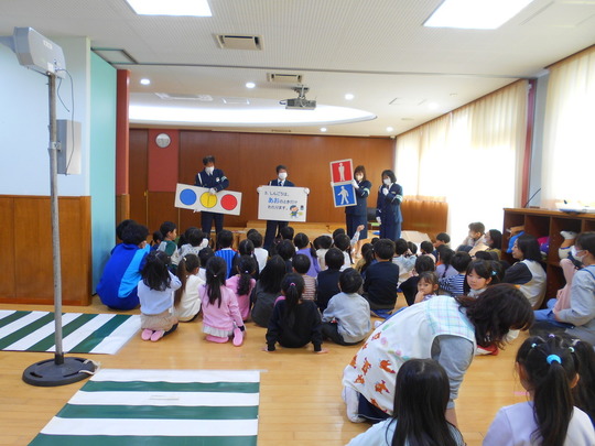 幼児クラスのお友だちみんなで交通安全教室に参加しました。初めに、交通ルールについてDVDをみて、イラストやクイズで楽しく交通安全について学びました。ぞう組のお友だちは、ホールに横断歩道や信号機を用意していただき、一人ひとり横断歩道を渡る練習をしました。