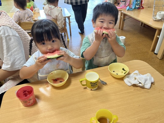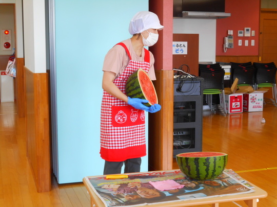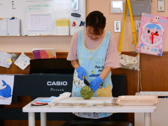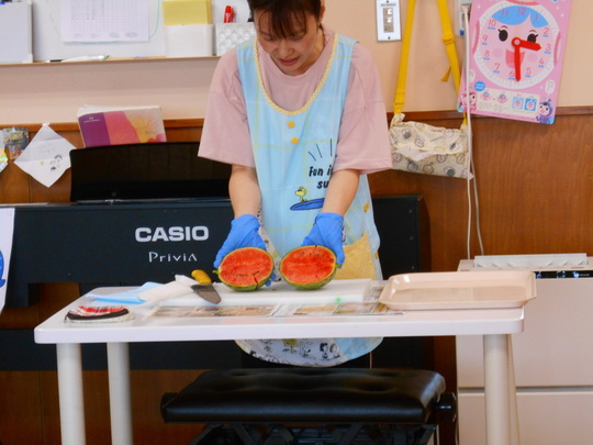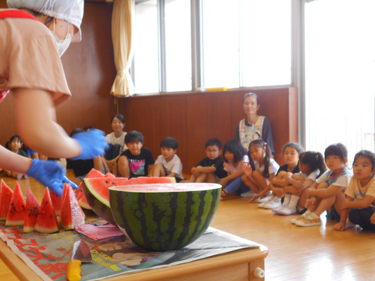 スイカ割りを楽しんだ後は、栄養士の先生がスイカを目の前でカット。「中身の色は何色かなー?」と聞くと「あか!」「きいろ!」と答えてくれました。スイカの中身が見えた時「あかだったー!」と正解に喜ぶ声も聞こえてきました。「甘い匂いもする~」と香りを感じた子もいたようです。