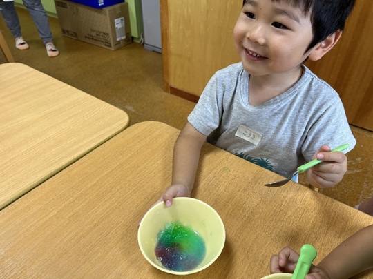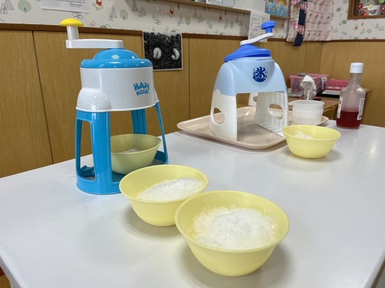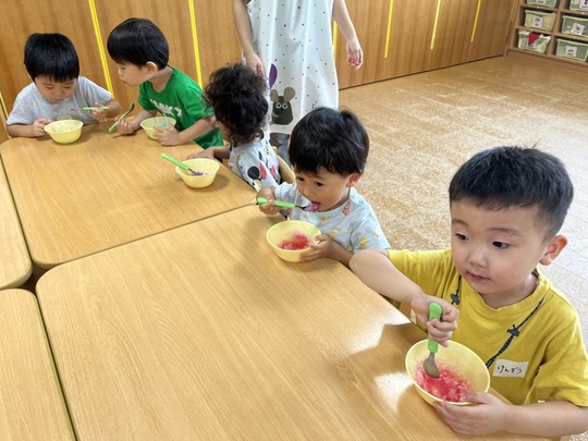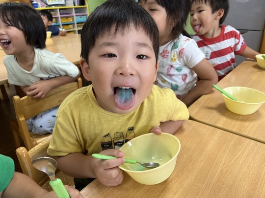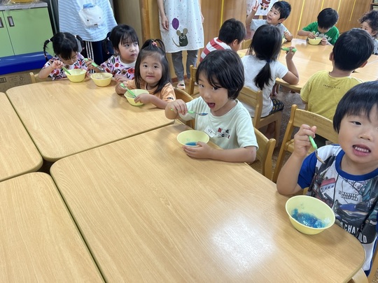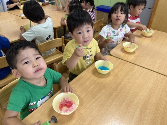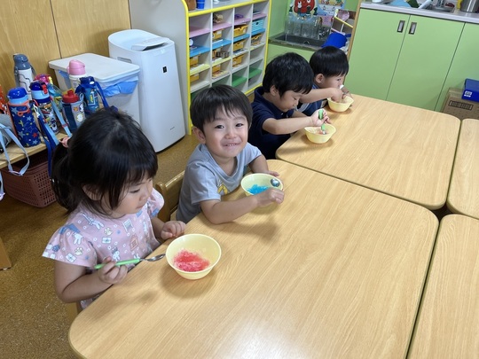 7月9日(火) 今日は体操の後、ぱんだ組でかき氷を食べました。以前から「かきごおり たべたーい!」とリクエストをしていました。