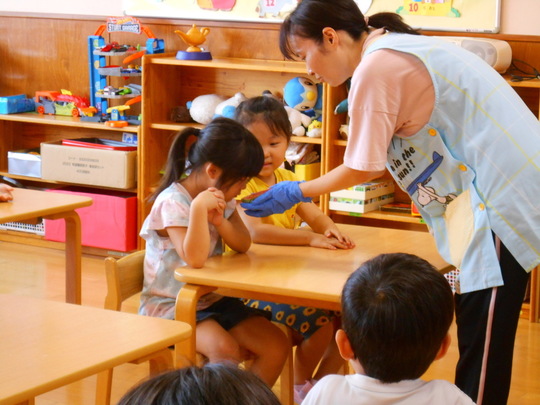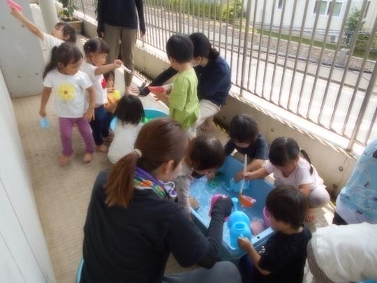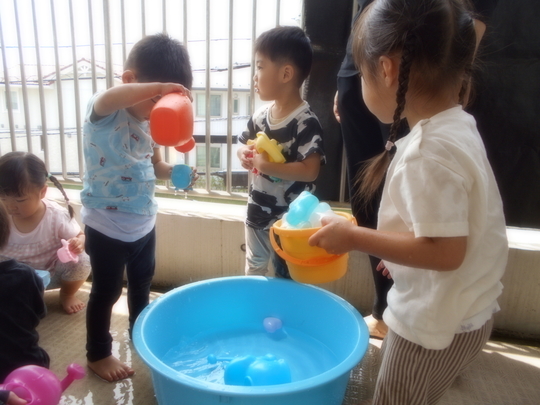 気温も30℃越えの日がでてきましたね。この時期楽しめるのが「みずあそび」です。子どもたちも準備していると興味深々で見つめていました。始まるとじょうろに水を入れて上から流してみたり手で触ることに少し緊張する場面も...もう少しするとプールも始まります。夏の楽しい思い出をたくさん作って欲しいですね。