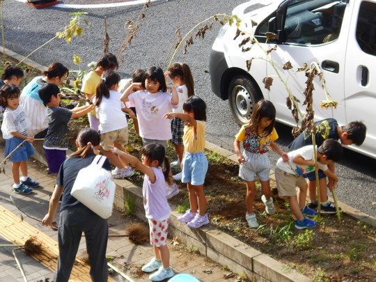そろそろ、種が収穫できそうなので、ぞう組が代表で花壇からひまわりを抜いて