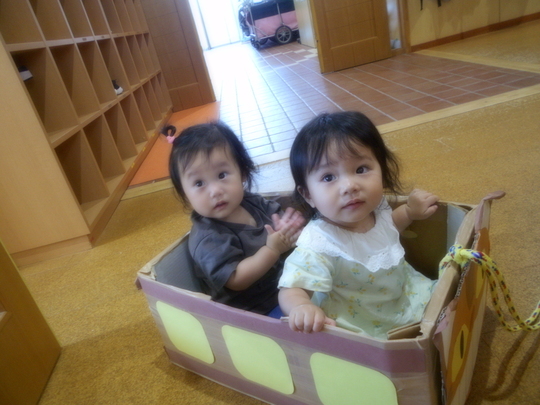 お友だちと乗って保育者に引っ張ってもらって他の保育室3階のお兄さんお姉さんのお部屋に行くこともあります。「かわい~♡」と言いてもらって。とっても嬉しそうなエ笑顔を見せてくれます。