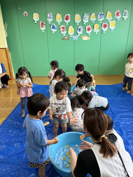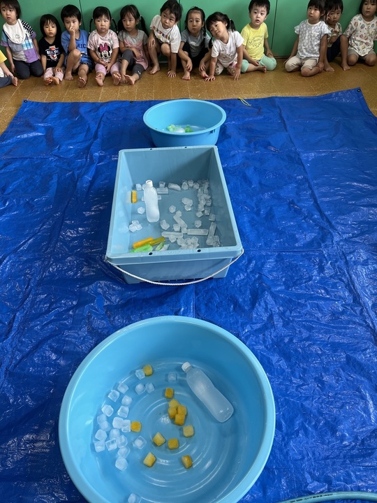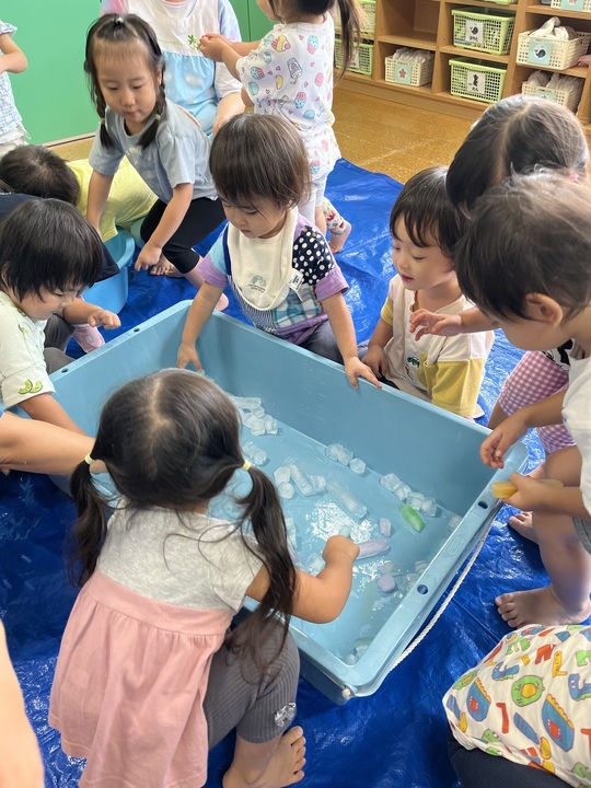 8月29日(木)うさぎ組保育室にブルーシートが引かれて子どもたちもソワソワ…。何やら「がらん、がらん」と音も聞こえてきます。音の正体は氷!でした。子どもたちもきれいな色に夢中の様子。しばらくすると「つめたーい!」