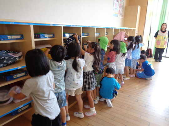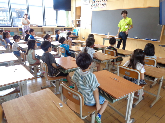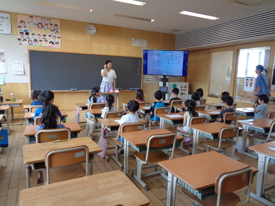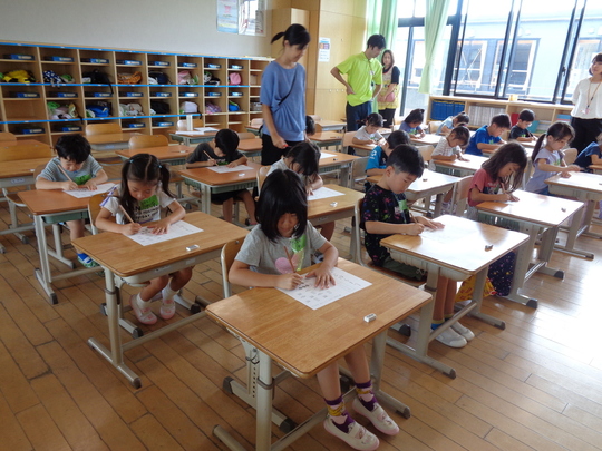 8月26日(月)小学校は夏休み。空いている教室を貸していただき、小学校の先生に企画していただいた授業を体験してきました。ロッカーに荷物を入れて、椅子に座ったら「…?なんだかいつもと違う様子の子どもたち。」どうやら緊張していたようです。