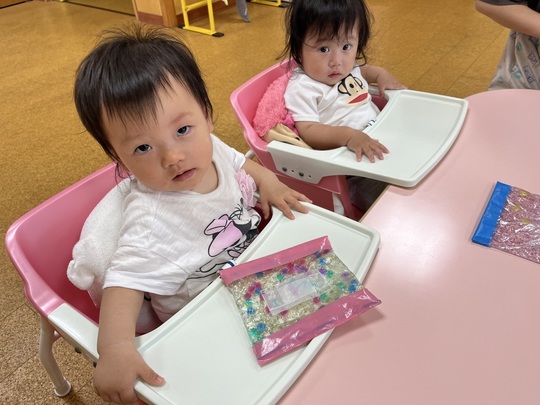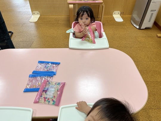 ひよこ組ではジップロックに糊を混ぜた液体にコロコロした部品を入れて、感触を楽しんでいました。冷蔵庫で冷やしたものは冷たくてまた違う感触です。次は「ハイハイランド」で体を動かしました。