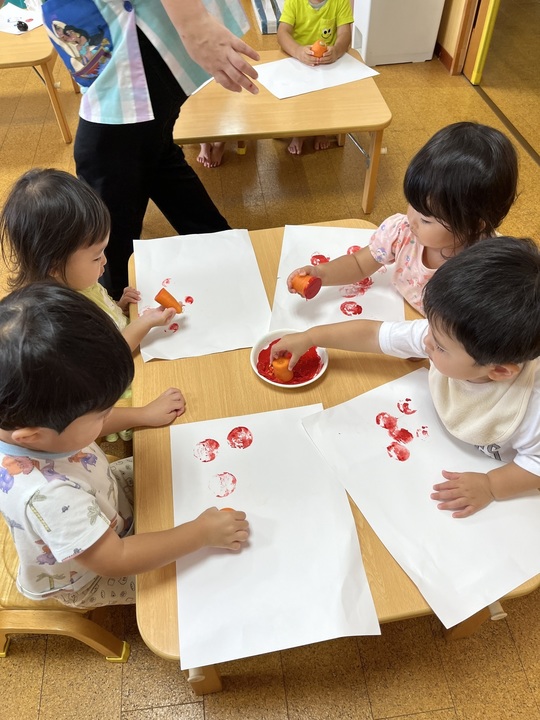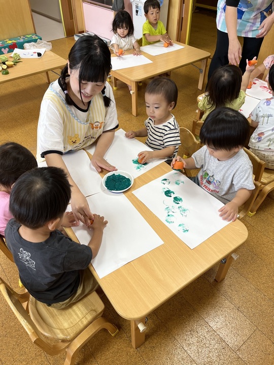 8月29日(木) 絵具を使ってやさいスタンプを楽しみました。楽しかったようで、紙には色々な色でいっぱいになりましたよ。