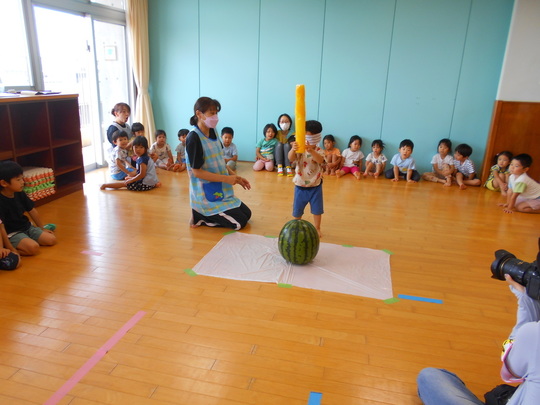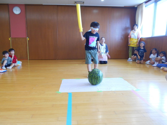 スイカを準備して、目隠しをしてから、その場で3回くるくる回ってスタート!お友だちの声でスイカまでたどり着いて「パシン!」とスイカに当てる子が多くいました。