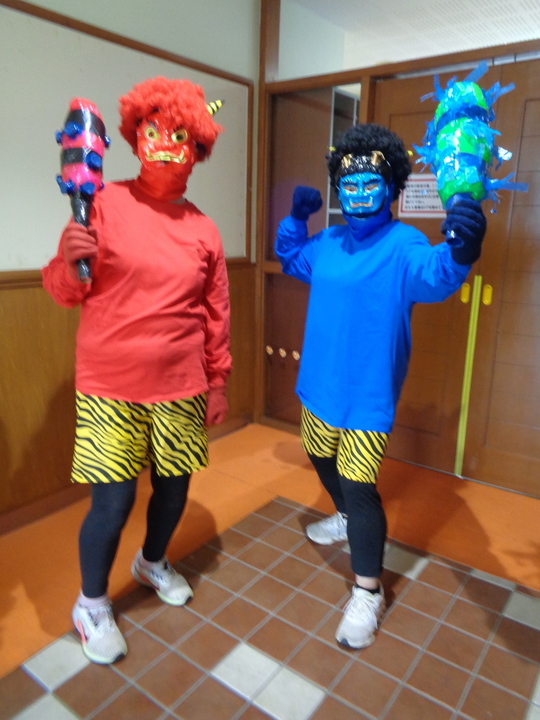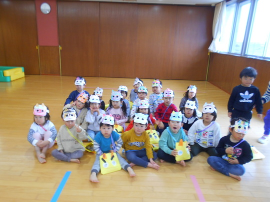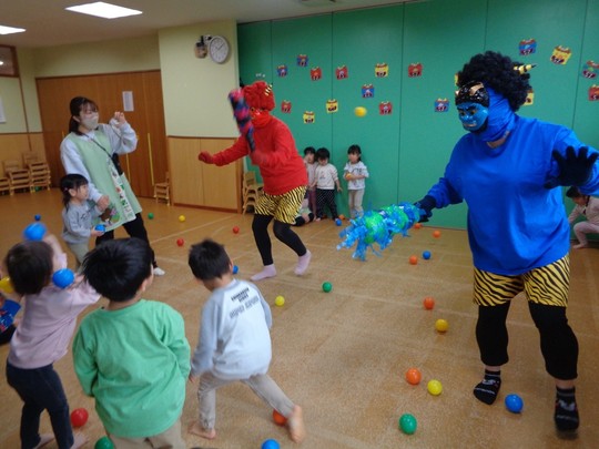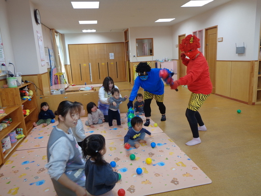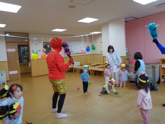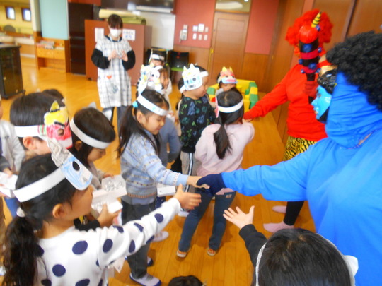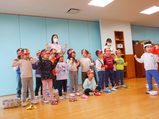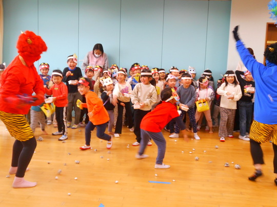 R7年2月3日(月)に節分集会が行われました。ホールでは、豆まきの前に先生から手遊び「鬼のパンツ」、せつぶんクイズ、お話「おにのつの」の出し物がありました。ひよこ・りす・うさぎ組は各クラスで、ぱんだ・きりん・ぞう組はホールで鬼のお面をつけ、大きな声で力いっぱい「おにわそと!」「ふくはうち!」と豆にみたてた新聞紙とアルミホイルを投げて、節分集会を楽しみました。最後は鬼さんと各クラス集合写真を撮りました。