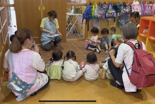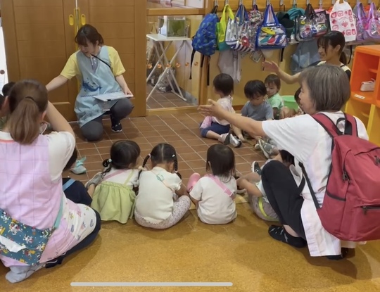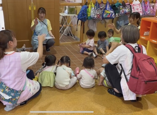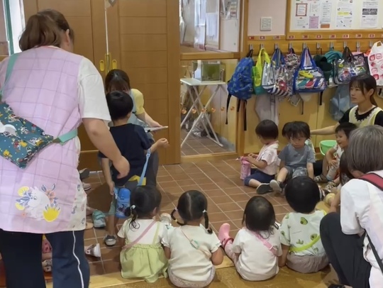 散歩・保育室移動等あった時は人数確認を複数で行います。園児全員座り、職員がきちんと顔を確認できるよう離れて座ります。